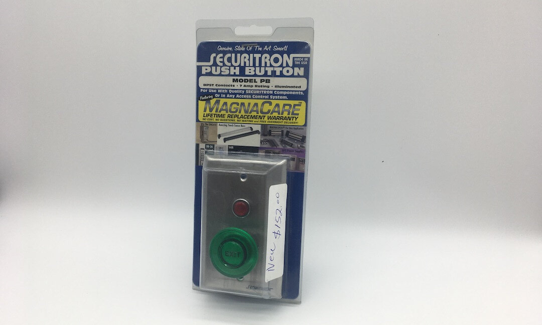 The Securitron Model PB features an industrial grade 1-1/2" mushroom button with 7 Amp DPST (NO/NC) contacts. It is waterproof (NEMA4) and includes 12-24 VDC bi-colour illuminations.